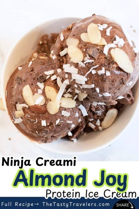 If Almond Joy is your candy bar, then this Ninja Creami Almond Joy Protein Ice Cream is going to completely ruin all other protein ice cream recipes for you. It has a deep, rich dark chocolate base with coconut flakes, chopped chocolate chips, and sliced almonds mixed right in, and it tastes EXACTLY like the candy bar it is named after. I promise you, this one is special.