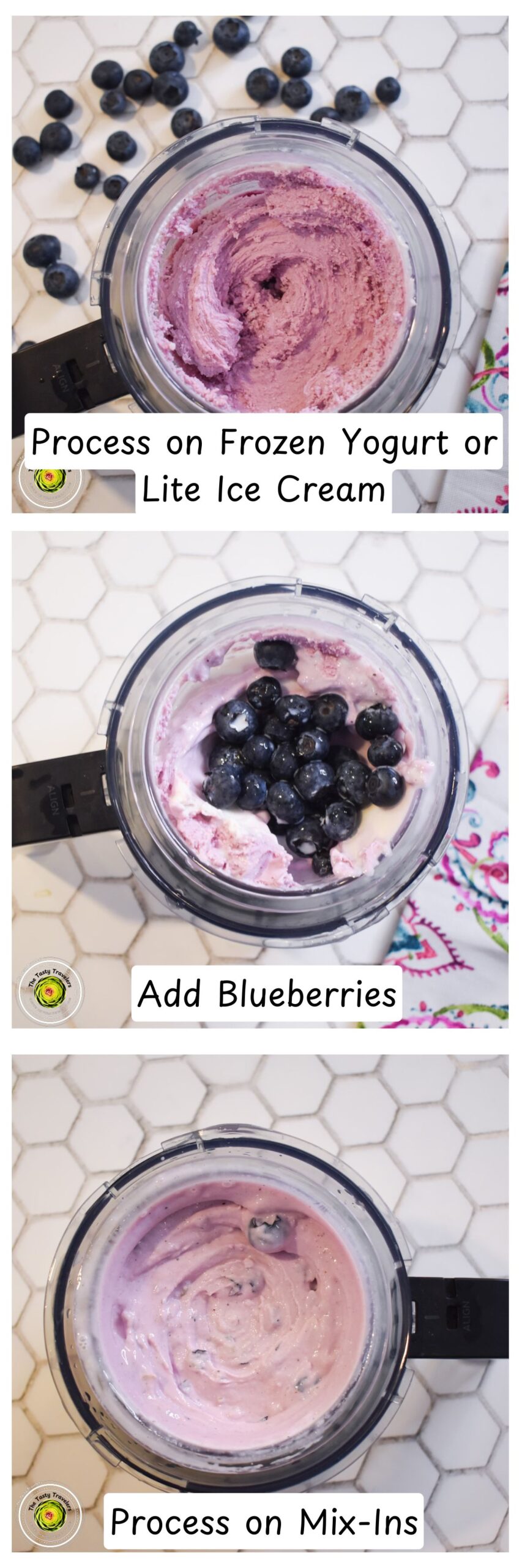 - Dig a well down the center of the ice cream and pour in the blueberries. Process on mix-ins.